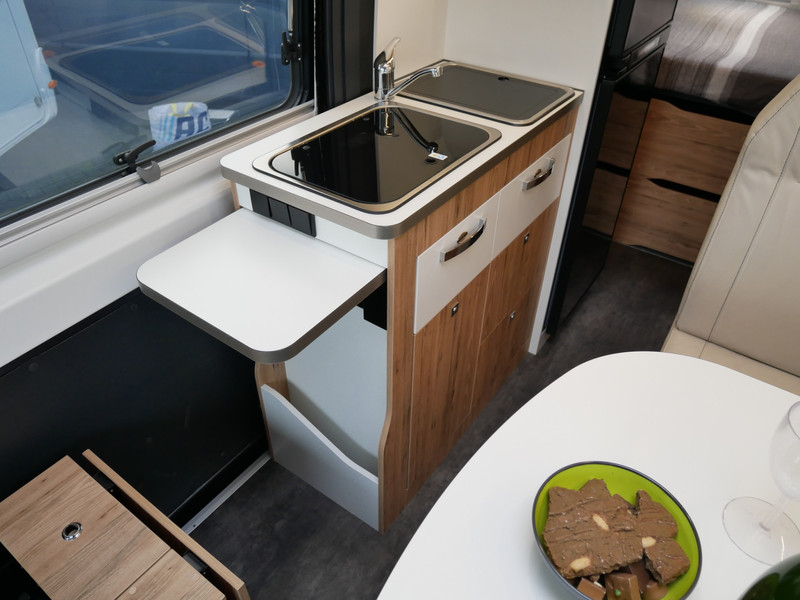 De camper is onder andere voorzien van een mooie afwerking met lederen bekleding en modern en licht ogende tinten in het interieur, keuken met 2 pits kooktoestel, dwarsbed, cruise control, Truma kachel gas, boiler op gas, XXL koelkast met apart vriesvak, wasbak, motorairco, veel kastruimte met ruime opbergmogelijkheden, toiletruimte met doucheruimte, een ruime zit met tafel en verduistering rondom.