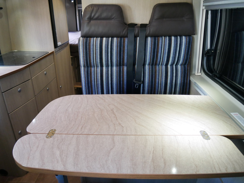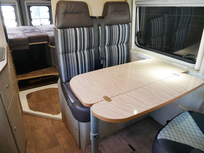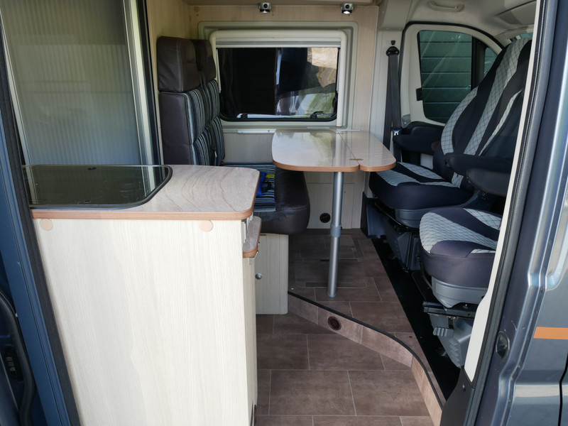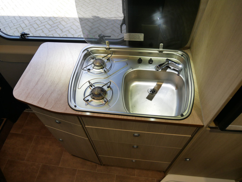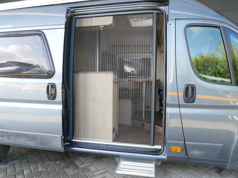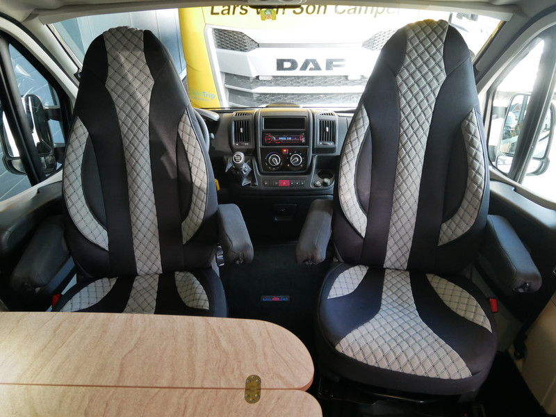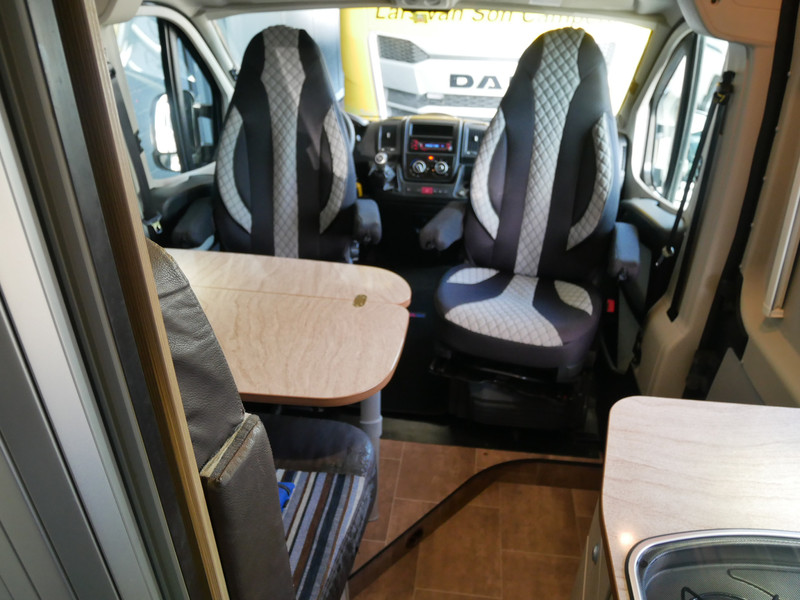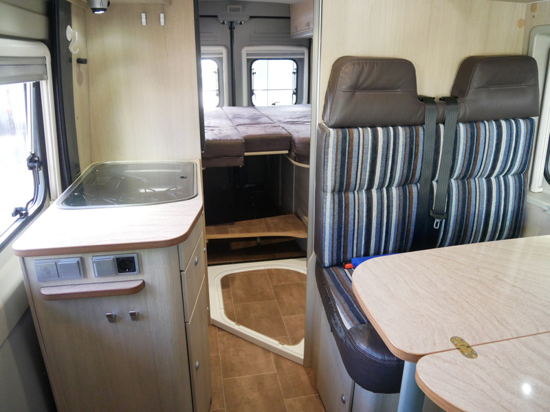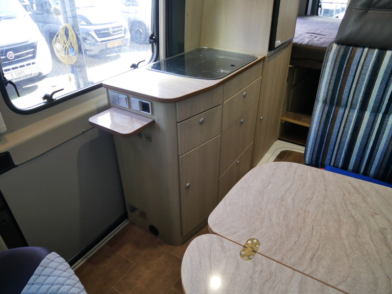 De camper is onder andere voorzien van een nette afwerking met stoffen bekleding en modern en licht ogende tinten in het interieur, keuken met 2 pits kooktoestel, lengtebedden, cruise control, Truma kachel op gas, boiler op gas, koelkast met een apart vriesvak, wasbak, motorairco, zeer veel opbergmogelijkheden door de vele bovenkasten, toiletruimte met doucheruimte, hordeur, een ruime zit met tafel en verduistering rondom.
