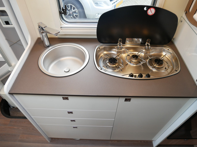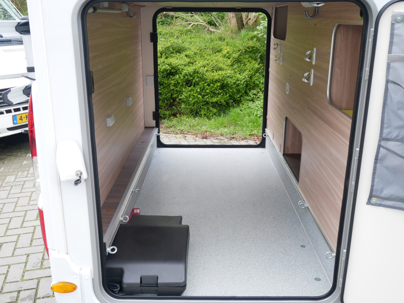 Verder is de camper voorzien van: zeer mooie en luxe afwerking met lichte stoffen stoelen, modern en elegante houtlook in het interieur, Truma combiketel op gas, luxe ruime keuken met 3 pits kooktoestel, hordeur entree, centrale deurvergrendeling, wasbak, motorairco, bluetooth, radio/cd/mp-3 speler, zeer veel opbergmogelijkheden in de vele bovenkasten en de grote kast ruimtes, ruime toiletruimte met wegdraaibare douche, XXL koelkast met vriesvak, een ruime L-zit met grote verschuifbare tafel en een XXL garage onder de lengtebedden met links en rechts een garagedeur.