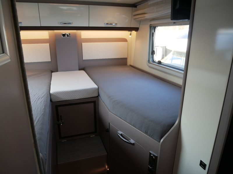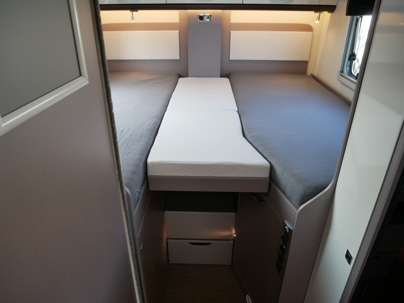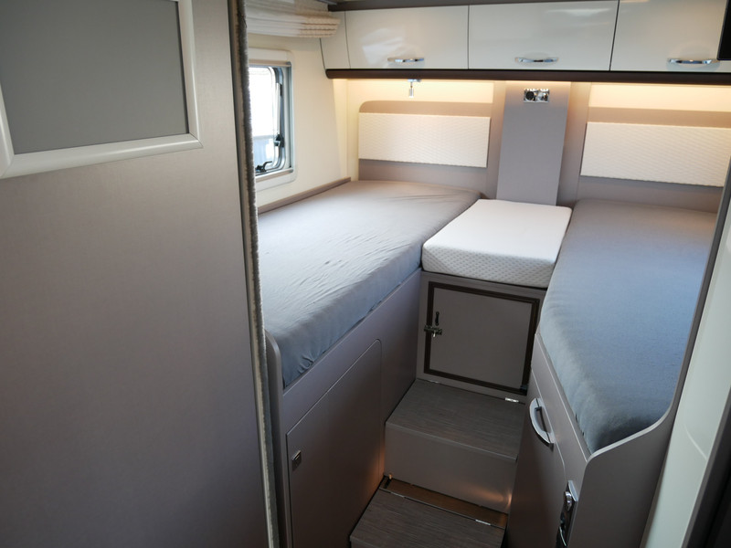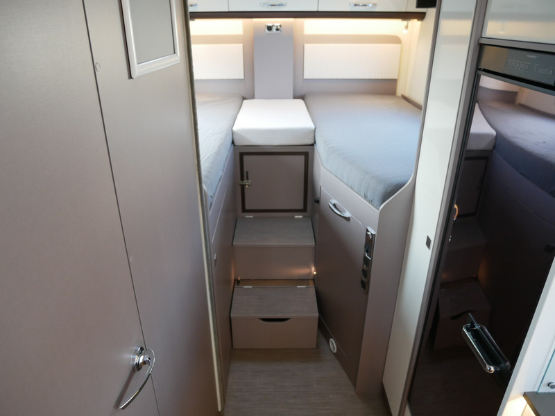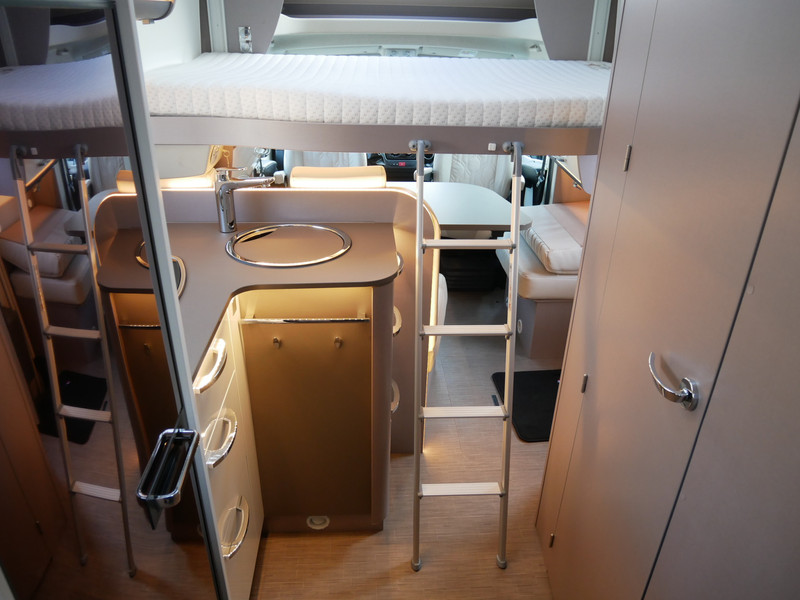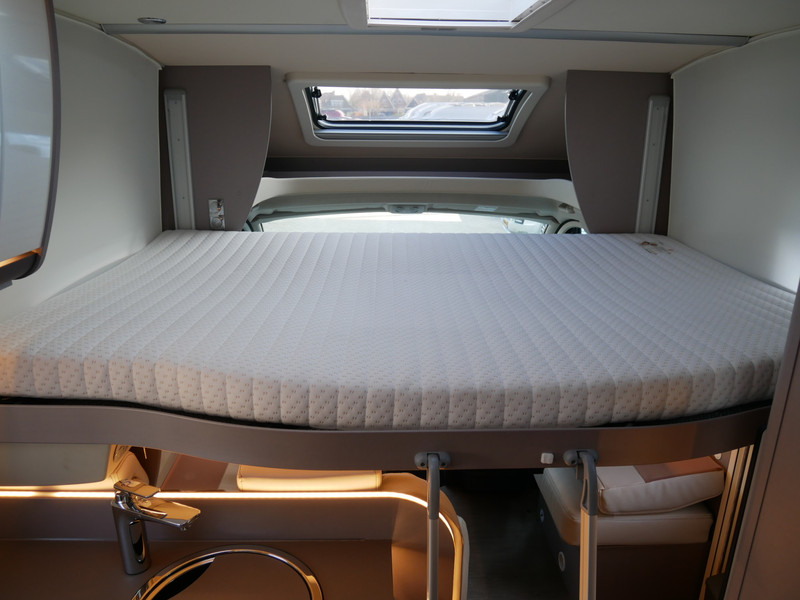 Maten: de camper heeft een stahoogte van 185 cm onder het hefbed, lengtebedden links: 198 x 80 cm, rechts: 202 x 80 cm, volledige breedte: 210 cm.