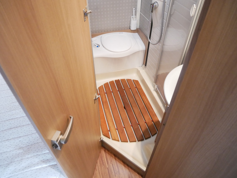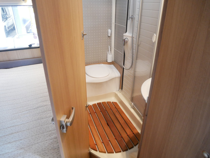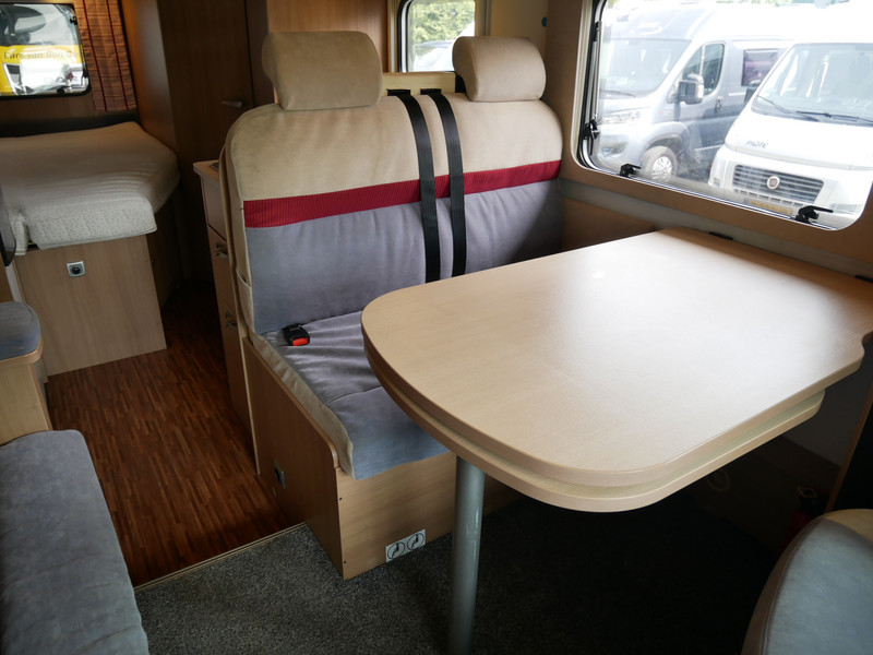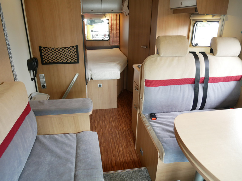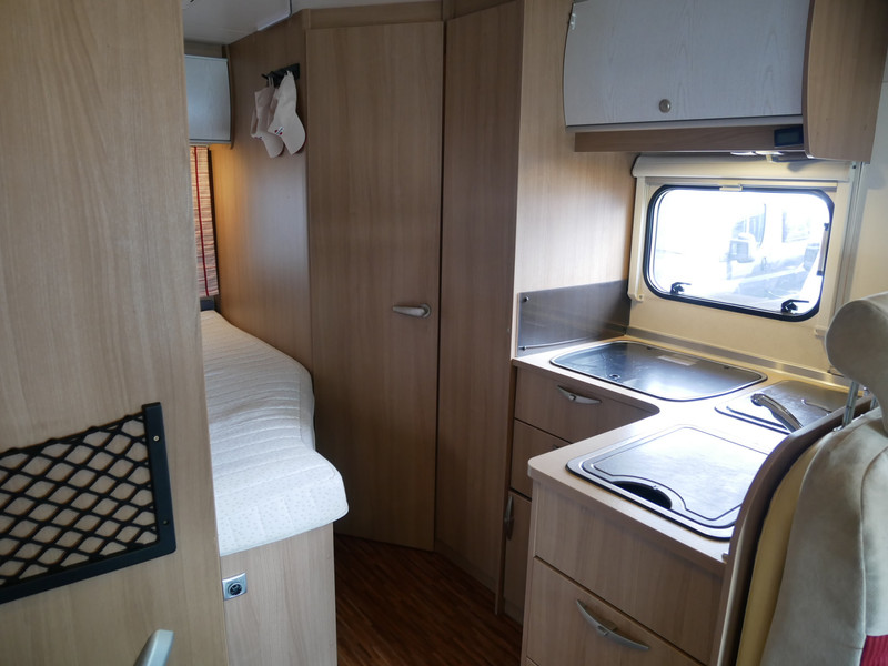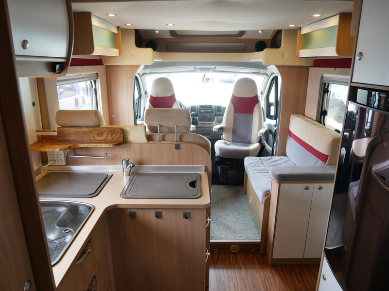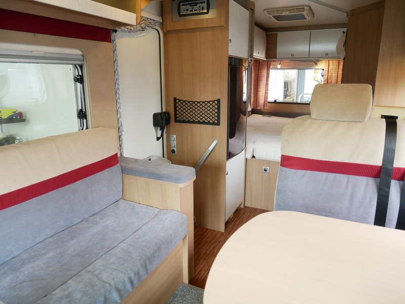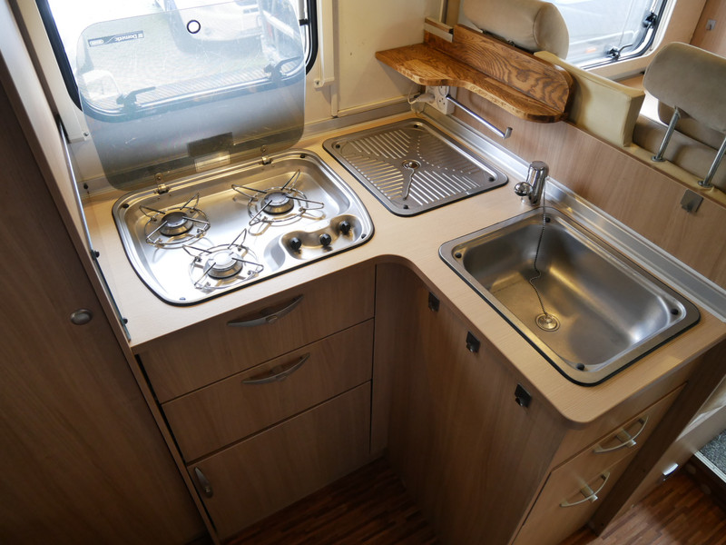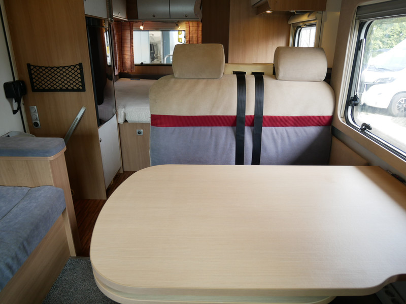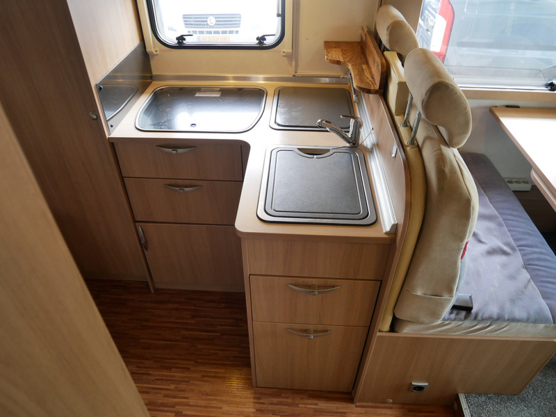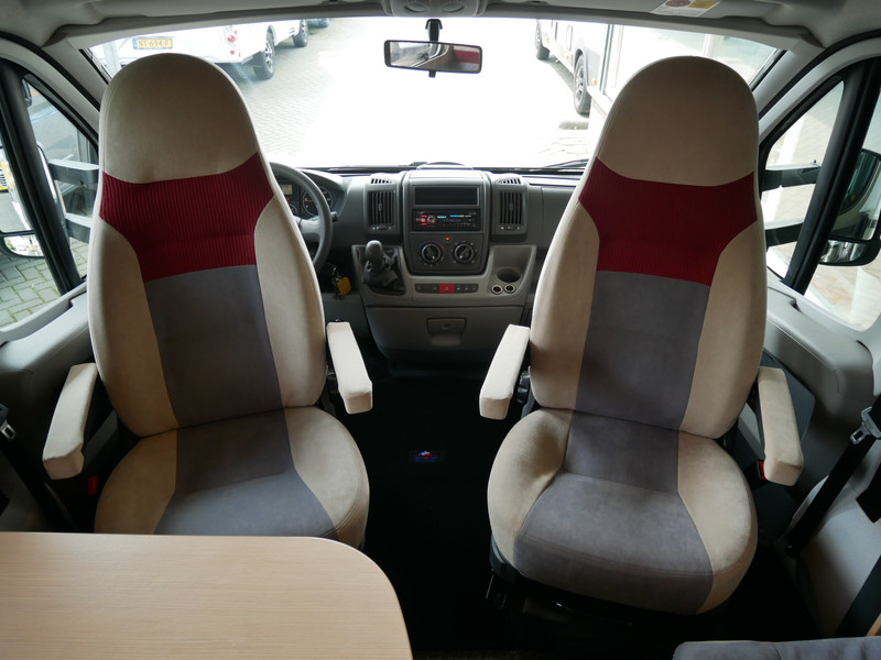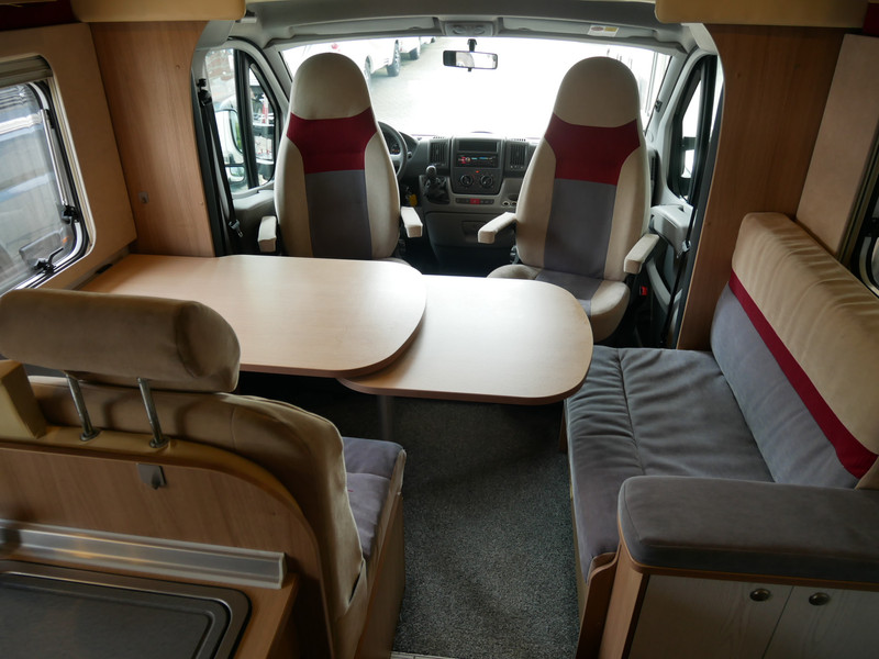 De camper is onder andere voorzien van luxe stoffen bekleding, mooie en lichte houtkleuren, ruime keuken met 3 pits kooktoestel, wasbak, entreedeur met vuilnisbak, motorairco, fransbed, hefbed, dubbelglas ramen, zeer veel opbergmogelijkheden door de vele kasten en slimme opbergvakken, badkamer met aparte douche en toiletruimte, een ruime rondzit met tafel en een garageluik links onder het fransbed.