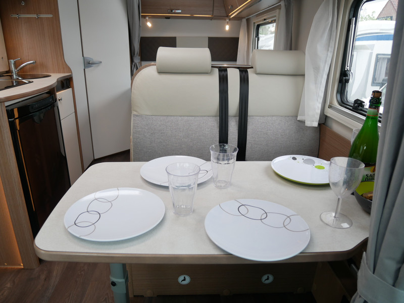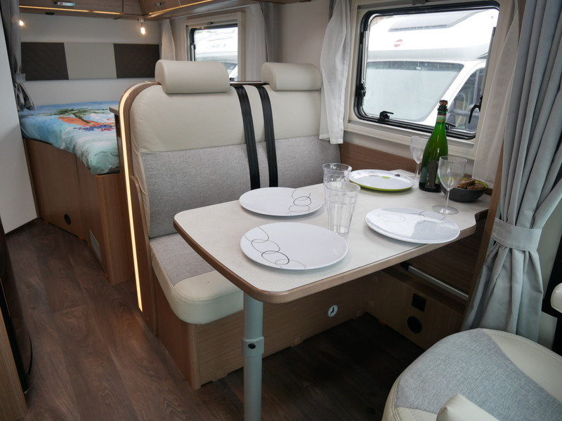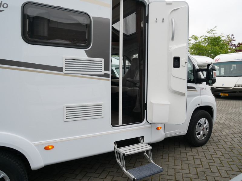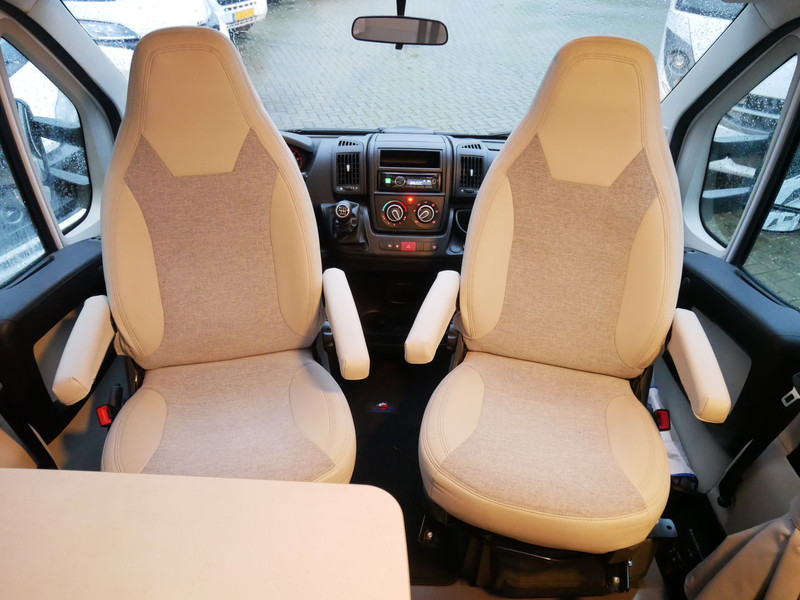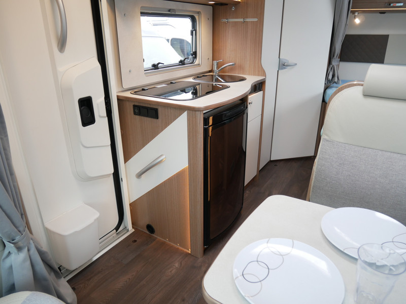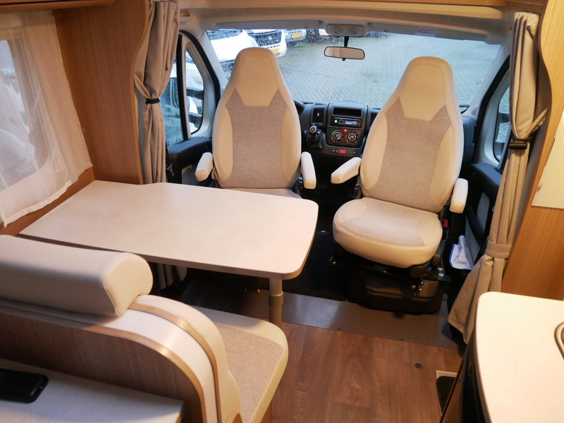 De camper is onder andere voorzien van een zeer mooie afwerking met half lederen stoelen, moderne houtlook in het interieur, cassette luifel, Truma combiketel op gas, luxe ruime keuken met 3 pits kooktoestel, hordeur, centrale deurvergrendeling met afstandsbediening, elektrische opstap, wasbak, motorairco, zeer veel opbergmogelijkheden in de vele bovenkasten en de grote kast ruimtes, ruime toiletruimte met douche, koelkast met vriesvak, een treinzit met grote tafel en een garage onder het Fransbed met een garagedeur.