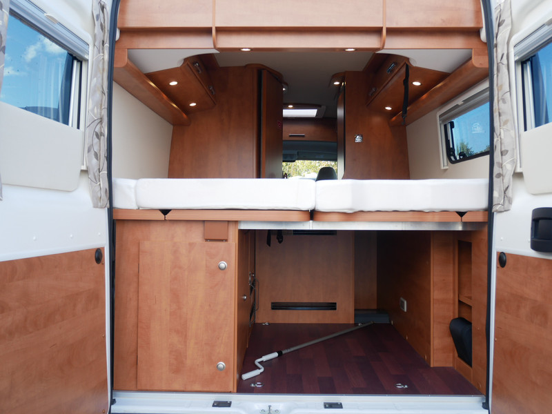 Maten: De camper heeft een stahoogte van 188 cm en de lengte bedden links: 195 X 100 cm, rechts: 185 X 100 cm en volle breedte met tussenstuk: 195 cm.