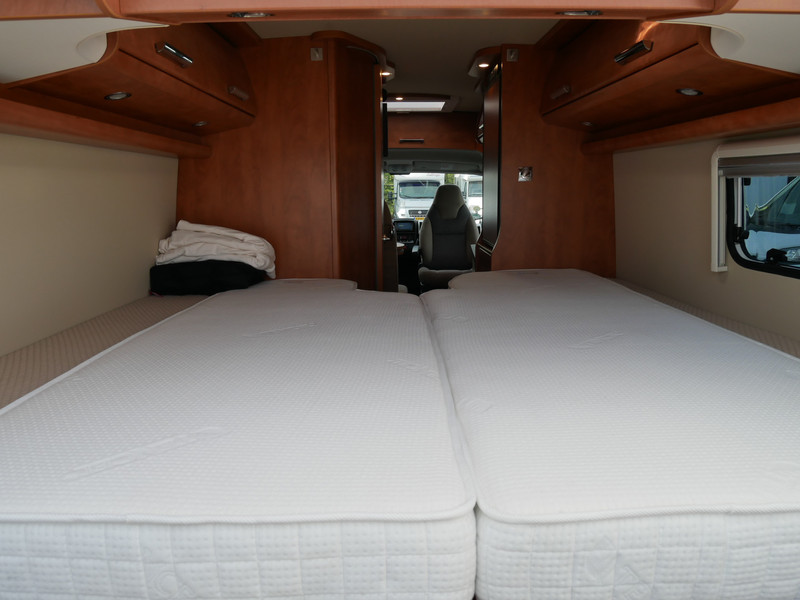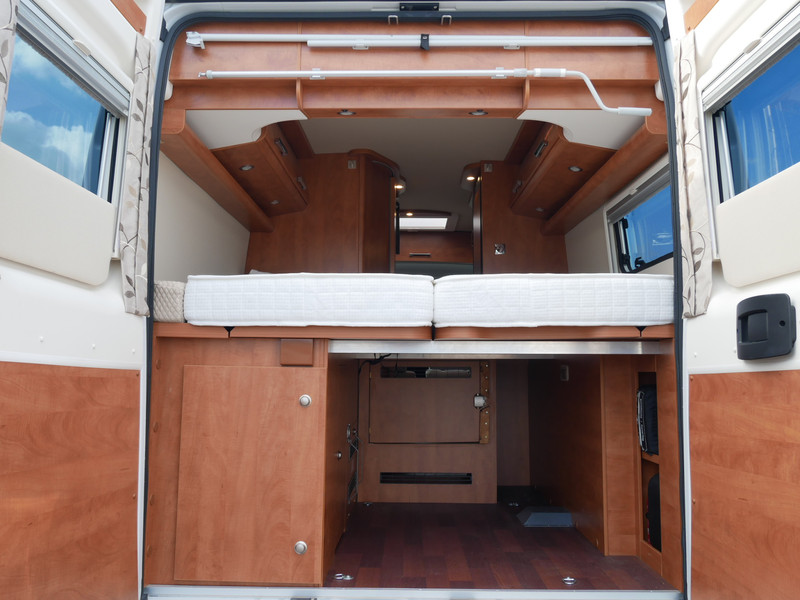Maten: De camper heeft een stahoogte van 188 cm en de lengte bedden links: 195 X 100 cm, rechts: 185 X 100 cm en volle breedte met tussenstuk: 195 cm.