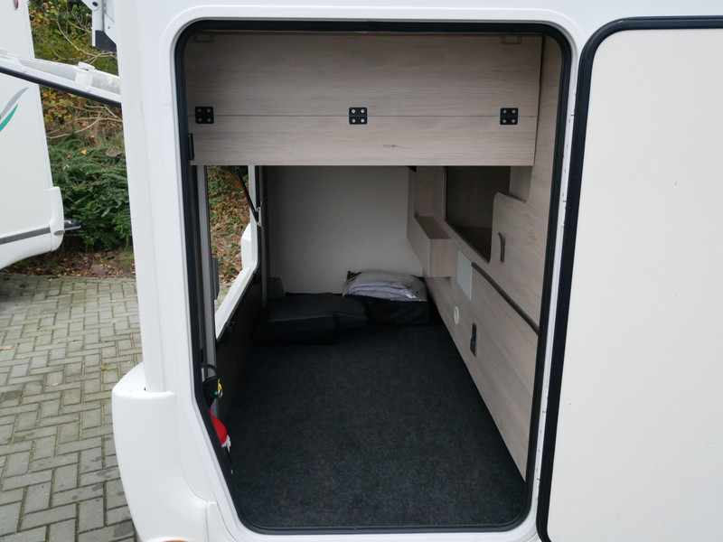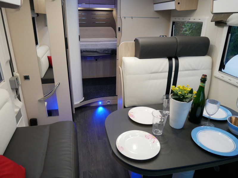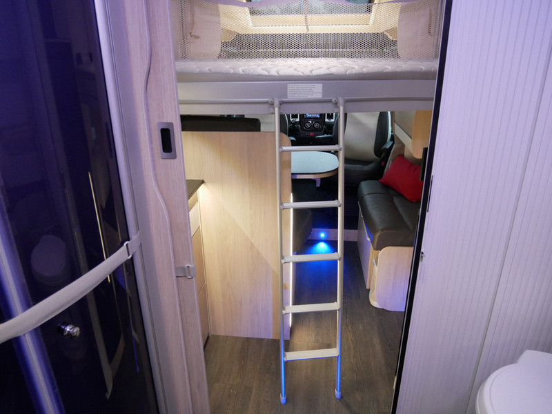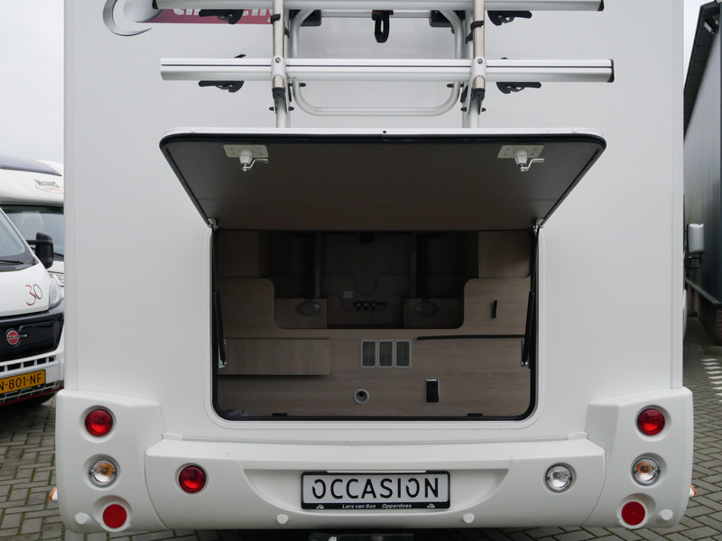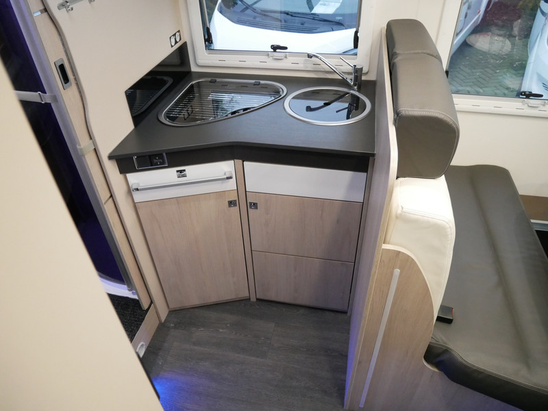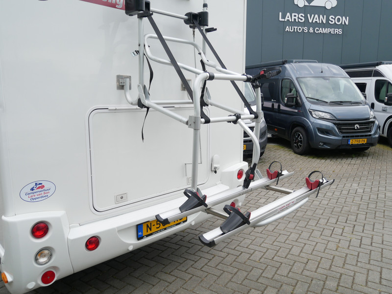 De camper is onder andere voorzien van een zeer mooie en luxe afwerking zoals half lederen stoelen, luxe en moderne look in het interieur, luxe ruime keuken met 3 pits kooktoestel, queensbed, hefbed, wasbak, hordeur entree, radio//mp-3 speler, motorairco, zeer veel opbergmogelijkheden door de zeer vele bovenkasten en de grote kast ruimtes, ruime toiletruimte met douche ruimte, een ruime rondzit met grote tafel en mooie grote garage onder het queensbed.