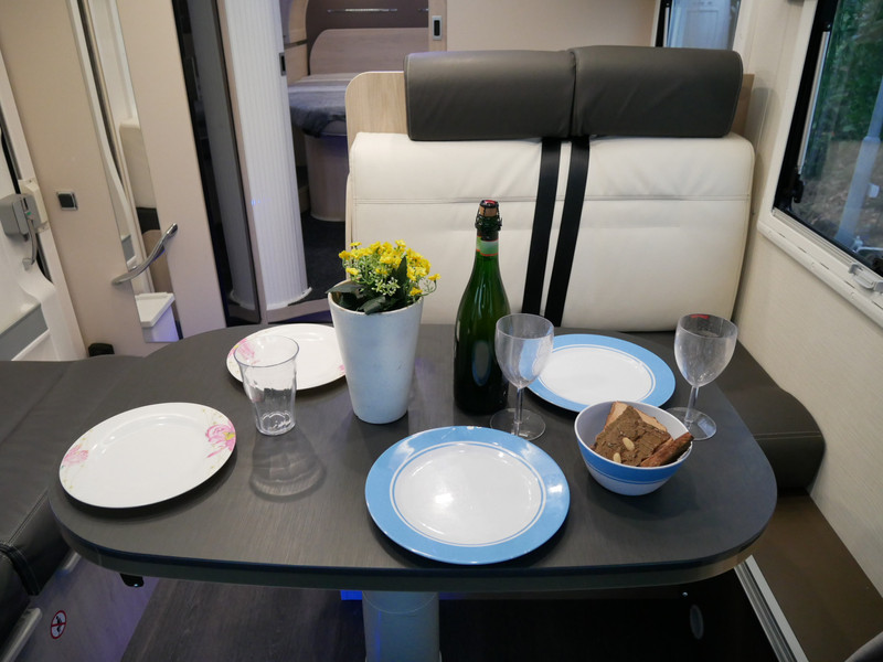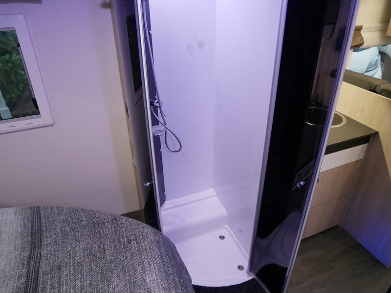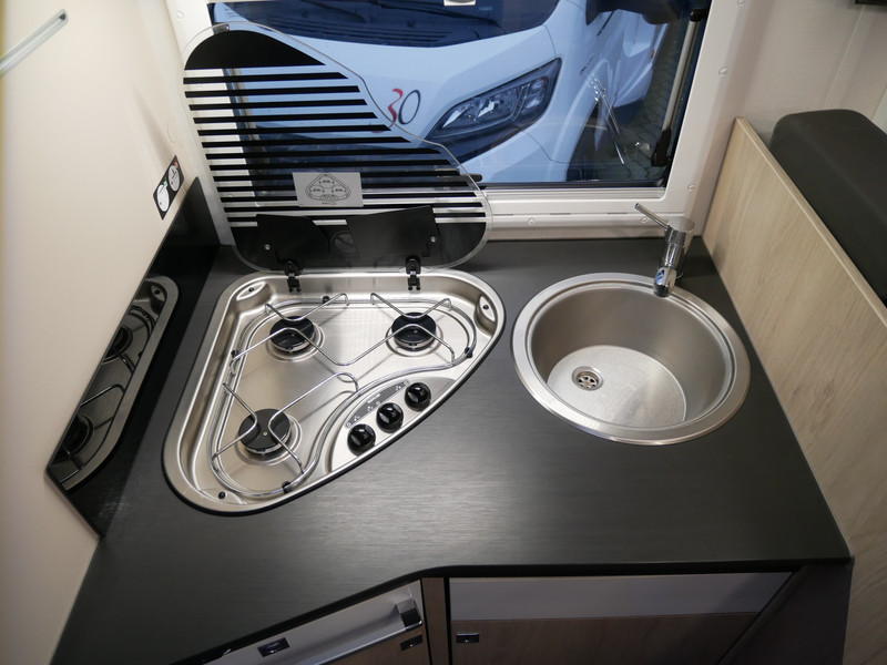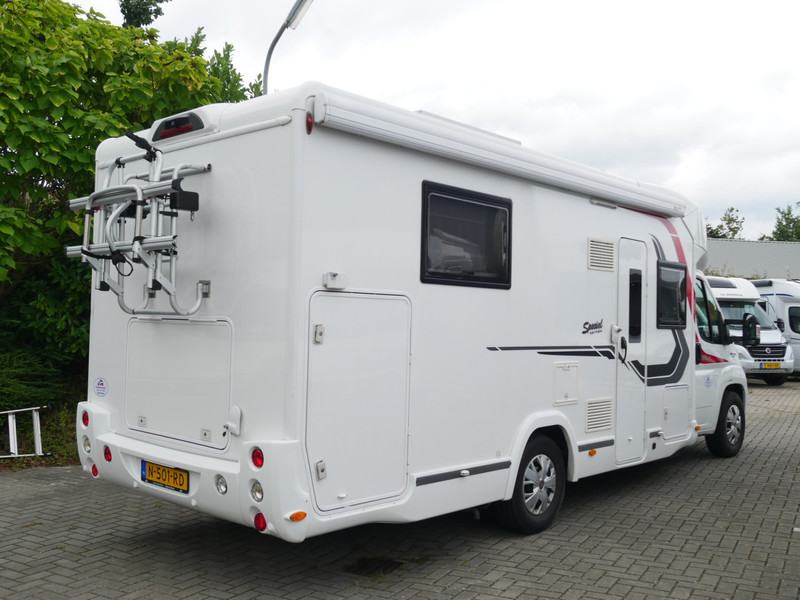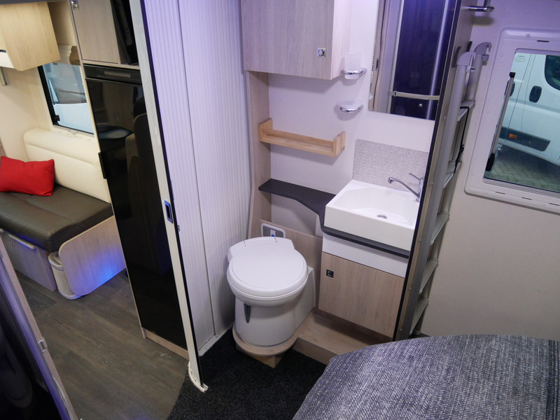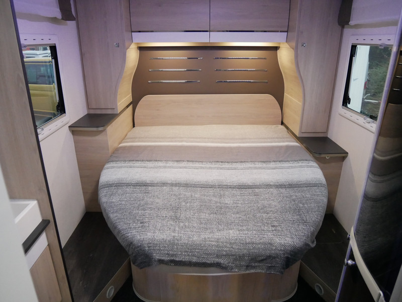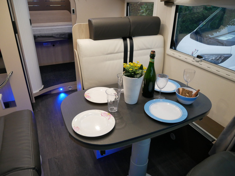 De camper is onder andere voorzien van een zeer mooie en luxe afwerking zoals half lederen stoelen, luxe en moderne look in het interieur, luxe ruime keuken met 3 pits kooktoestel, queensbed, hefbed, wasbak, hordeur entree, radio//mp-3 speler, motorairco, zeer veel opbergmogelijkheden door de zeer vele bovenkasten en de grote kast ruimtes, ruime toiletruimte met douche ruimte, een ruime rondzit met grote tafel en mooie grote garage onder het queensbed.