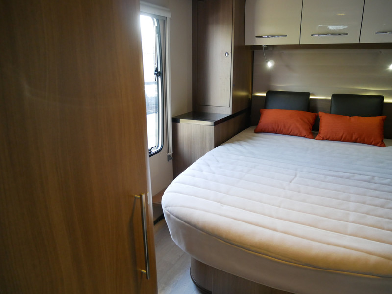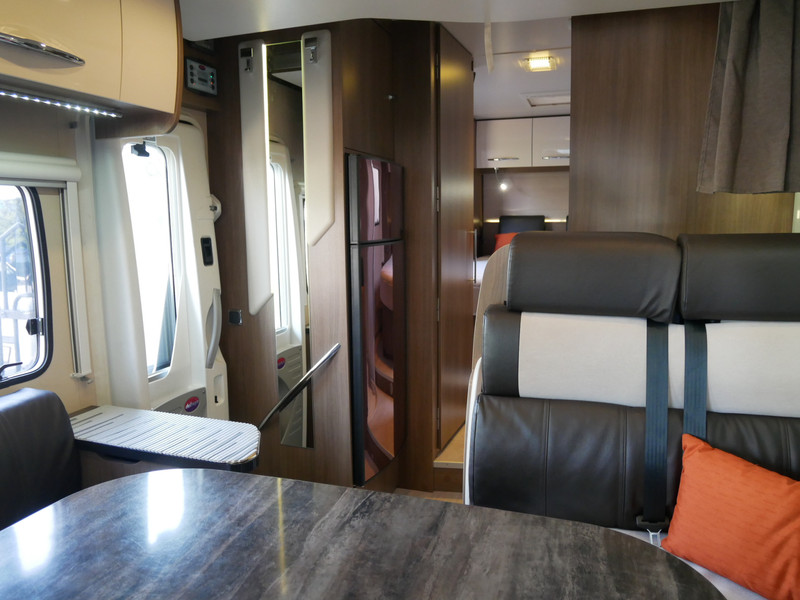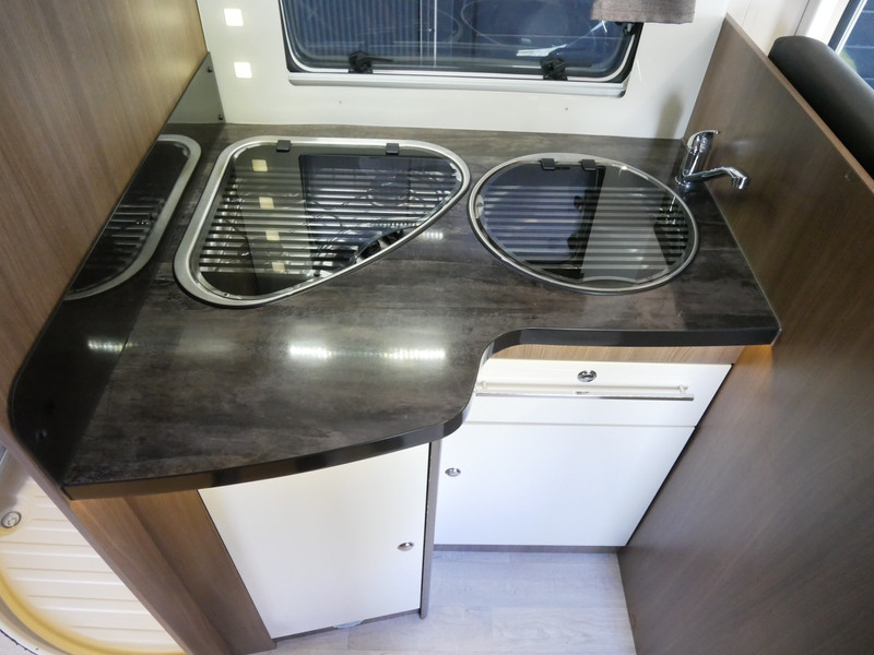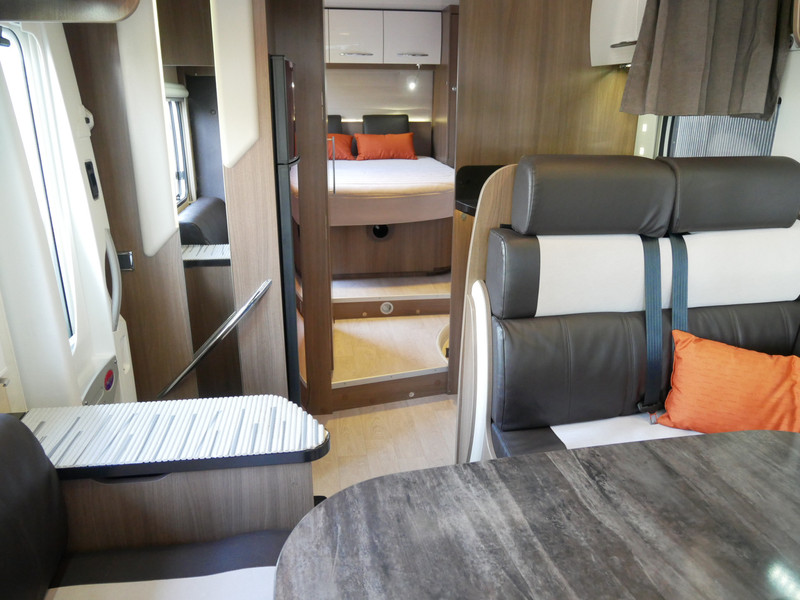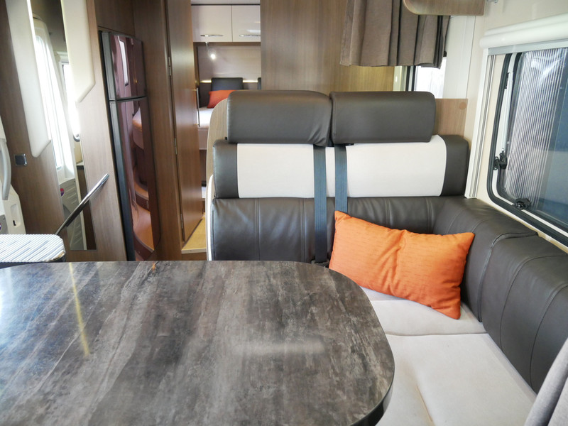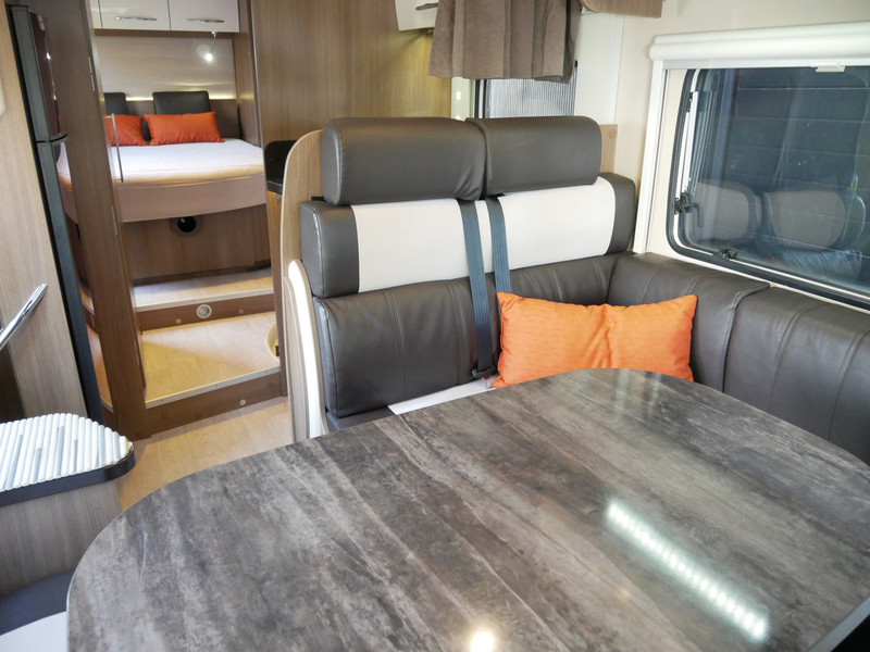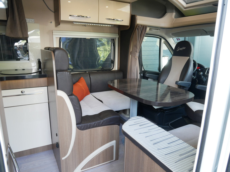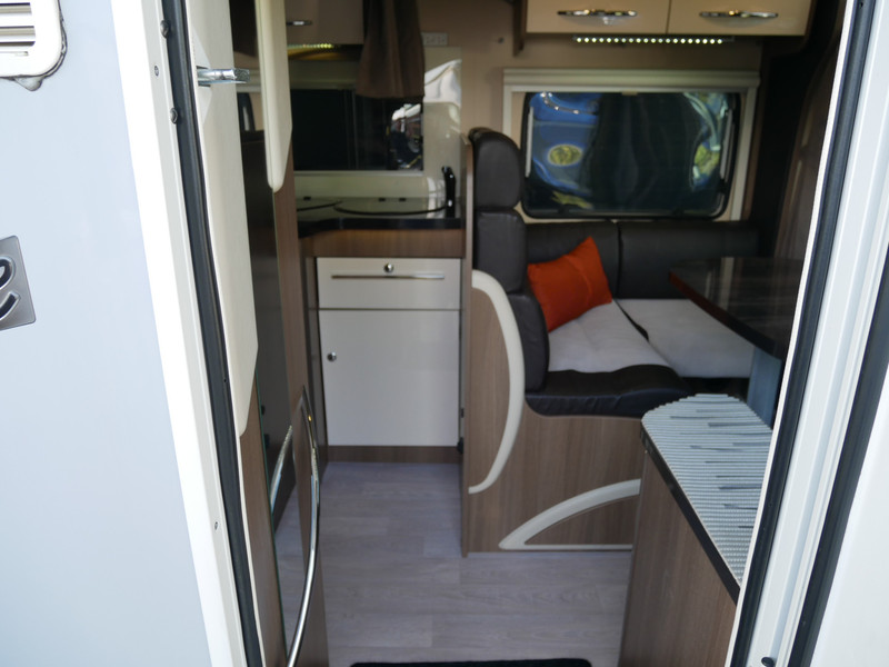 De camper is onder andere voorzien van een zeer mooie en luxe afwerking zoals half lederen stoelen, luxe en moderne look in het interieur, luxe ruime keuken met 3 pits kooktoestel, queensbed, hefbed, wasbak, hordeur entree, radio//mp-3 speler, bluetooth, motorairco, zeer veel opbergmogelijkheden door de zeer vele bovenkasten en de grote kast ruimtes, ruime toiletruimte met douche ruimte, een ruime rondzit met grote tafel en mooie grote garage onder het queensbed.