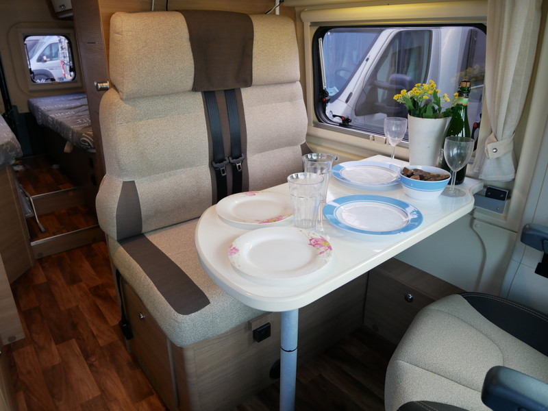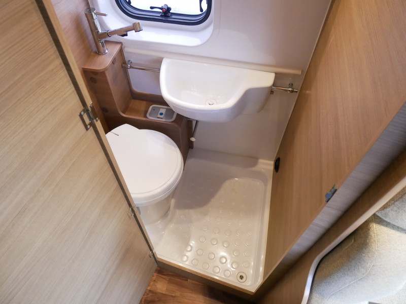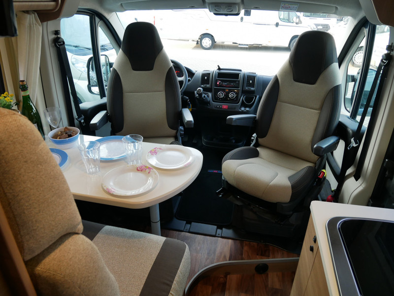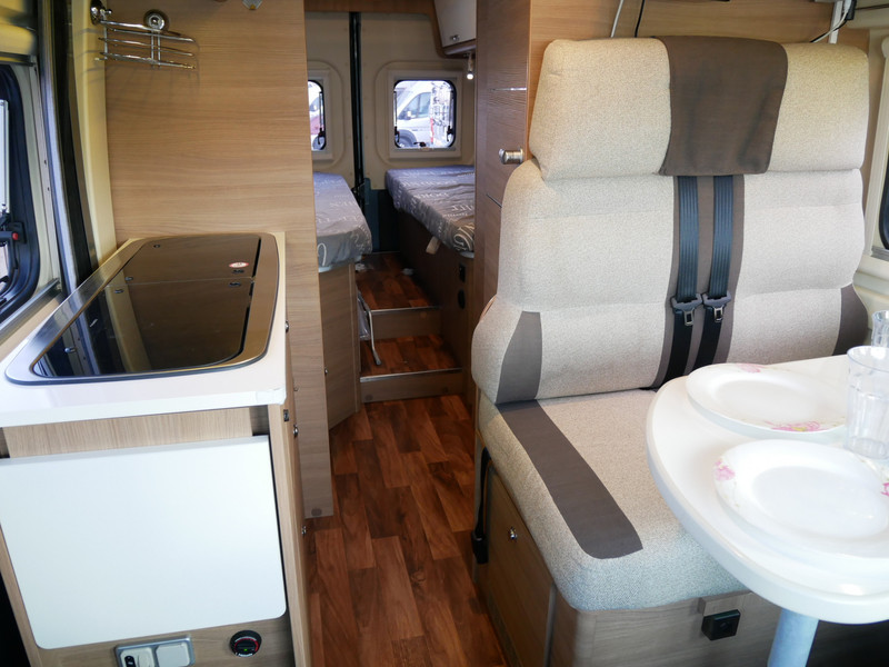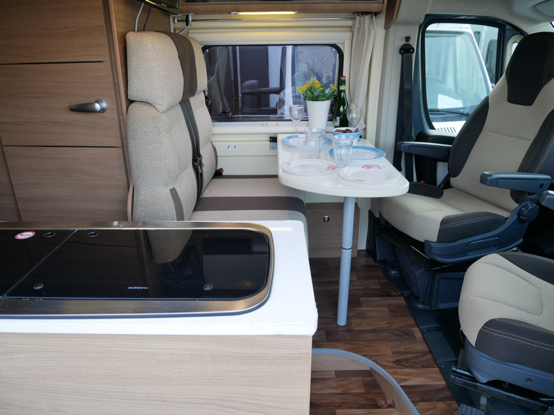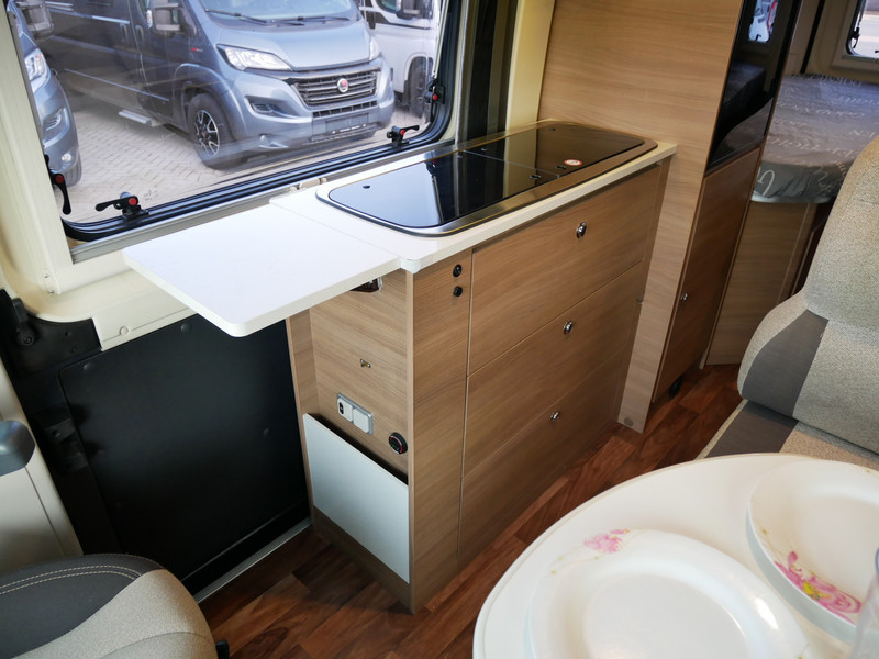 De camper is onder andere voorzien van een mooie en nette afwerking met stoffen bekleding, veel kastruimte, keuken met 2 pits kooktoestel, lengtebedden, cruise control, Webasto kachel op diesel, boiler op gas, koelkast met apart vriesvakje, luxe en licht ogende tinten in het interieur, wasbak, airco, hordeur entree, zeer veel opbergmogelijkheden door de zeer vele bovenkasten, toiletruimte met doucheruimte, een zit met tafel, achteruitrijcamera en radio/cd/mp-3 speler.