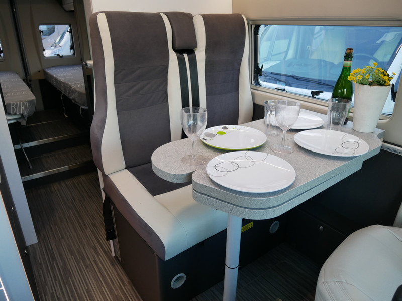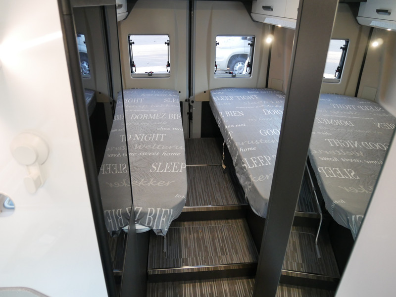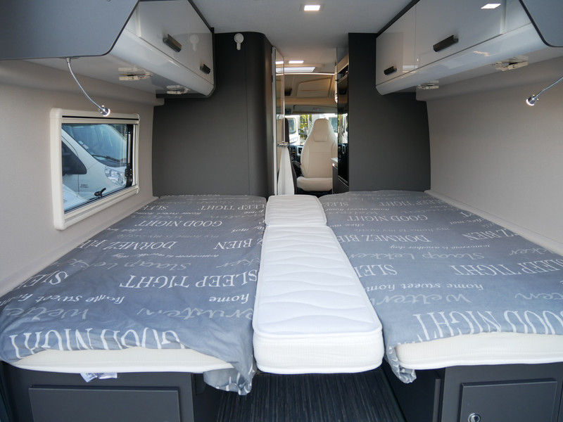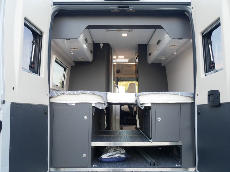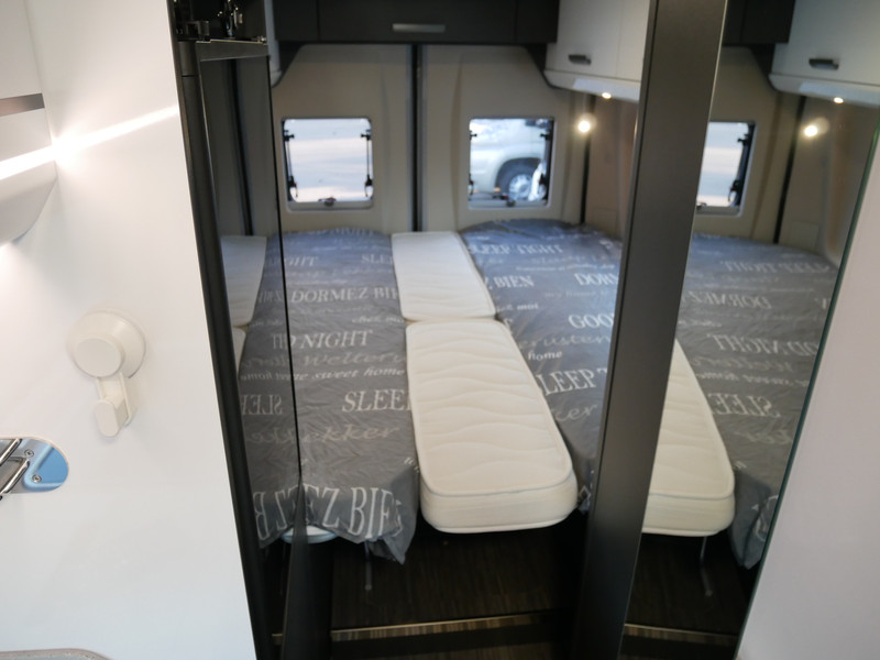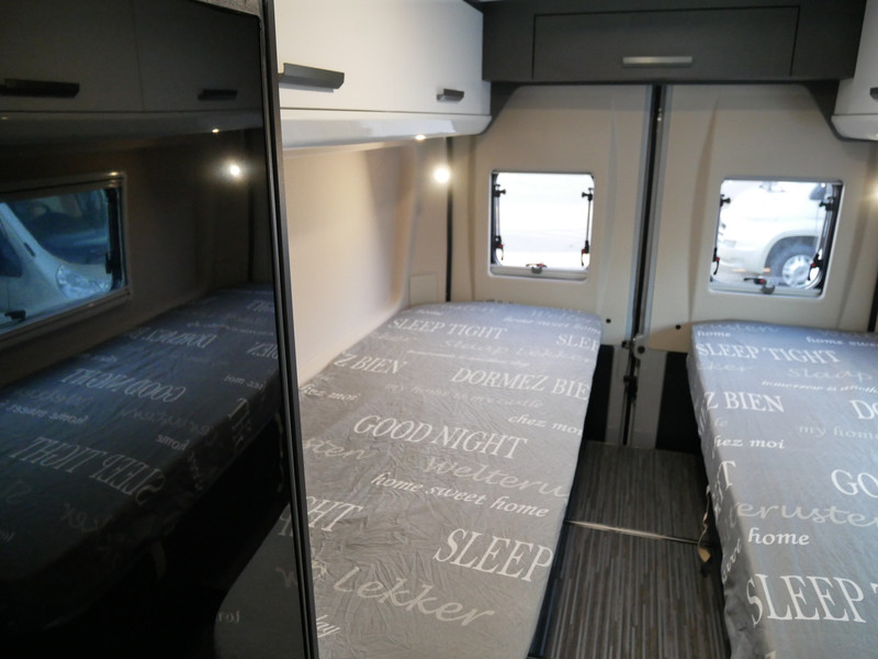 Maten: de camper heeft een stahoogte van 188 cm en maten van de lengtebedden: links: 195 x 85 cm, rechts: 190 x 85 cm en volle breedte: 195 cm.