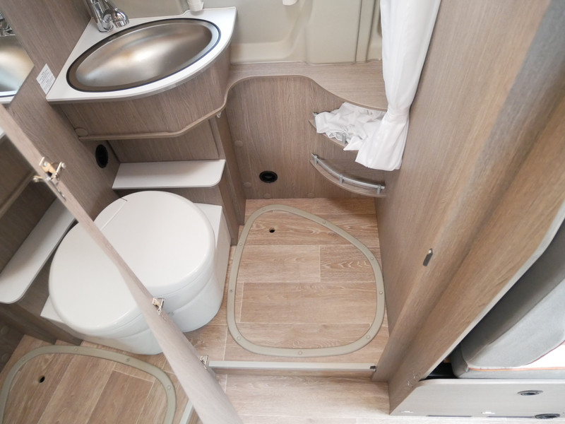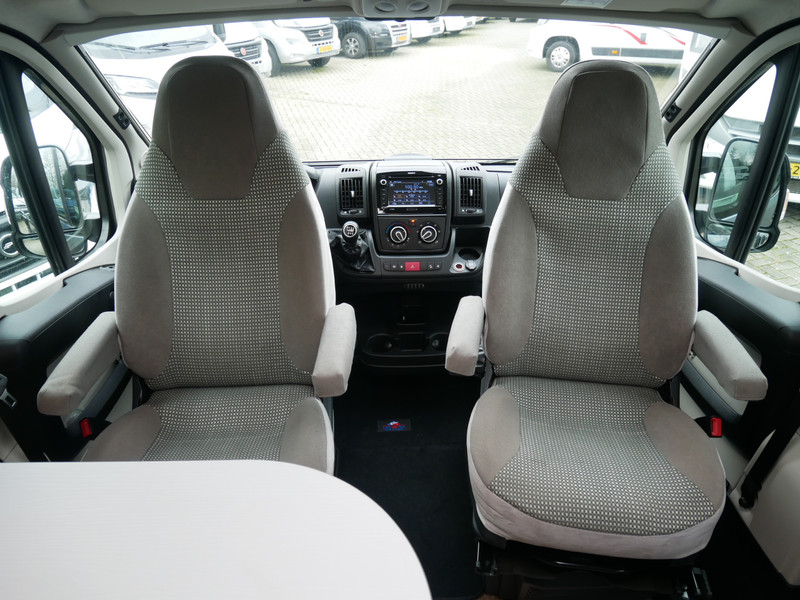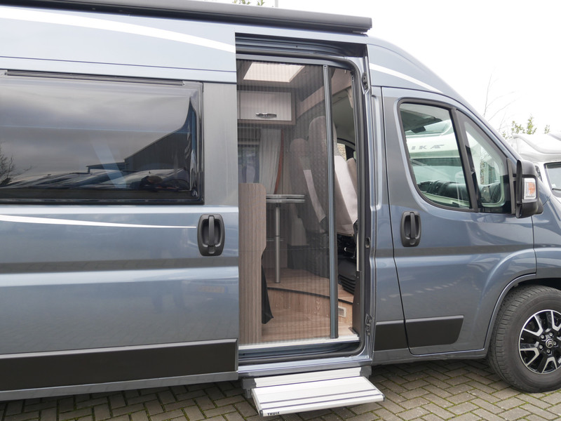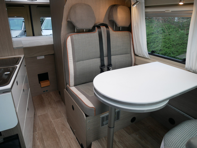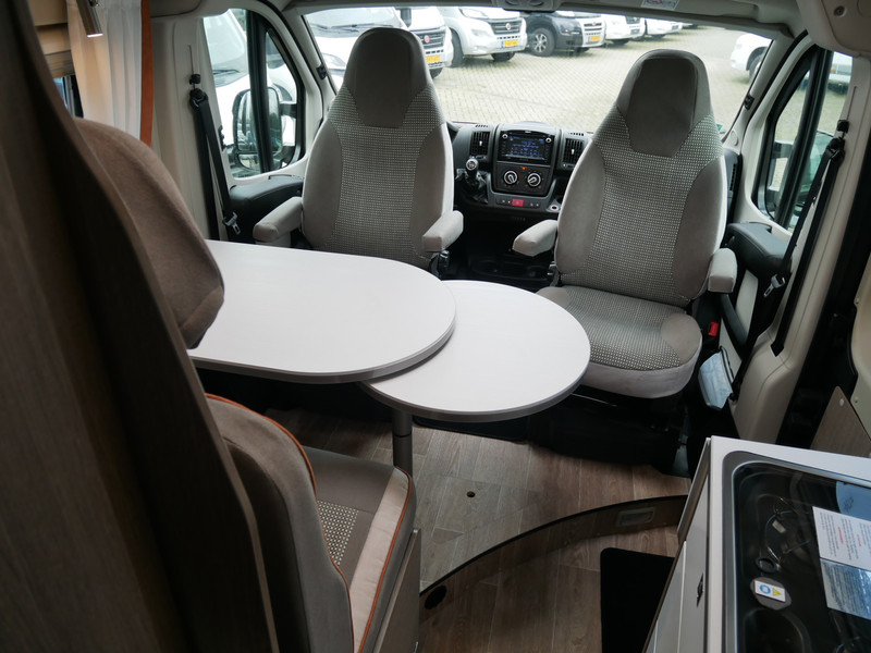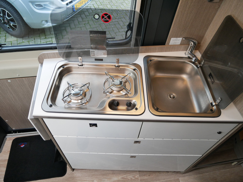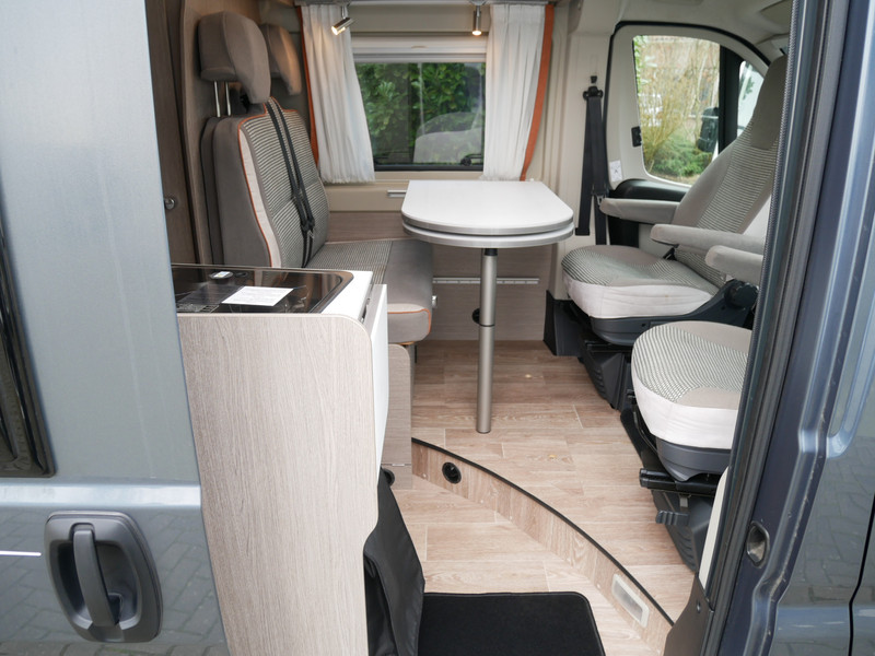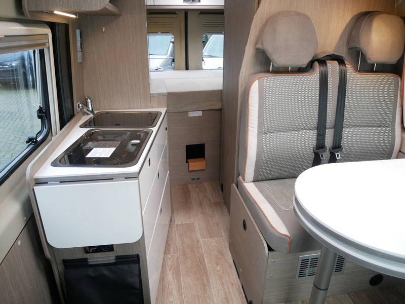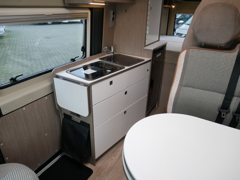 De camper is onder andere voorzien van een mooie afwerking met stoffen bekleding, luxe keuken met 2 pits kooktoestel, Truma kachel op gas, boiler, lichte moderne houttinten in het interieur, wasbak, motorairco, zeer veel opbergmogelijkheden door de vele kasten, toiletruimte met douche, radio/cd/mp-3 speler, bluetooth, achteruitrijcamera, verduistering rondom, een ruime zit met tafel en een metallic lak!