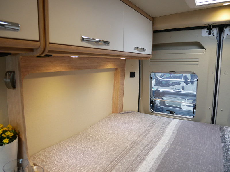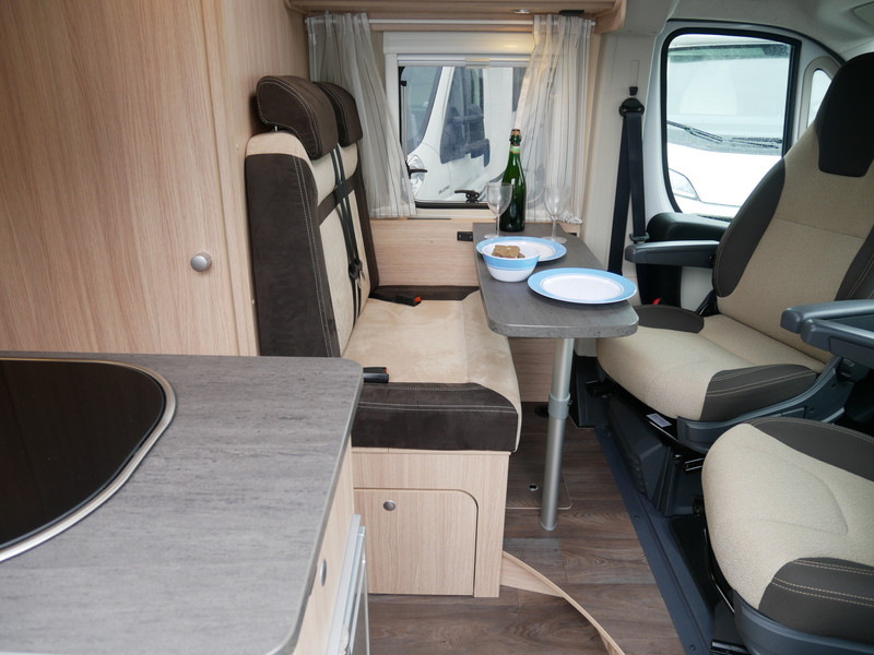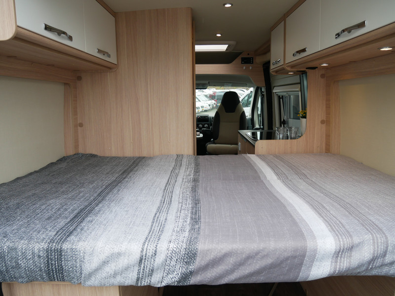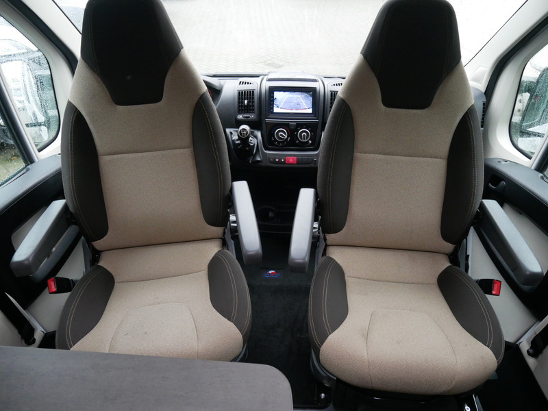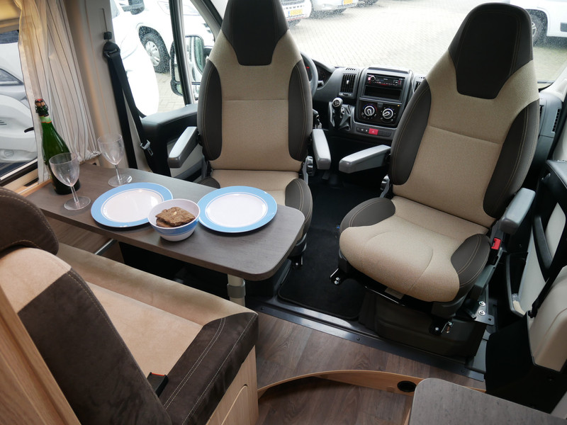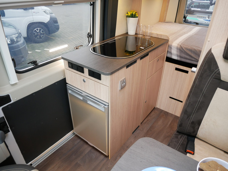 De camper is onder andere voorzien van een mooie afwerking met stoffen bekleding, keuken met 2 pits kooktoestel, dwarsbed, truma kachel op gas, boiler, compressor koelkast, modern en licht ogende houttinten in het interieur, binnenverlichting, wasbak, airco, zeer veel opbergmogelijkheden door de zeer vele bovenkasten, toiletruimte met douchecel, een zit met tafel, luifel, radio/cd/mp-3 speler en motorairco.