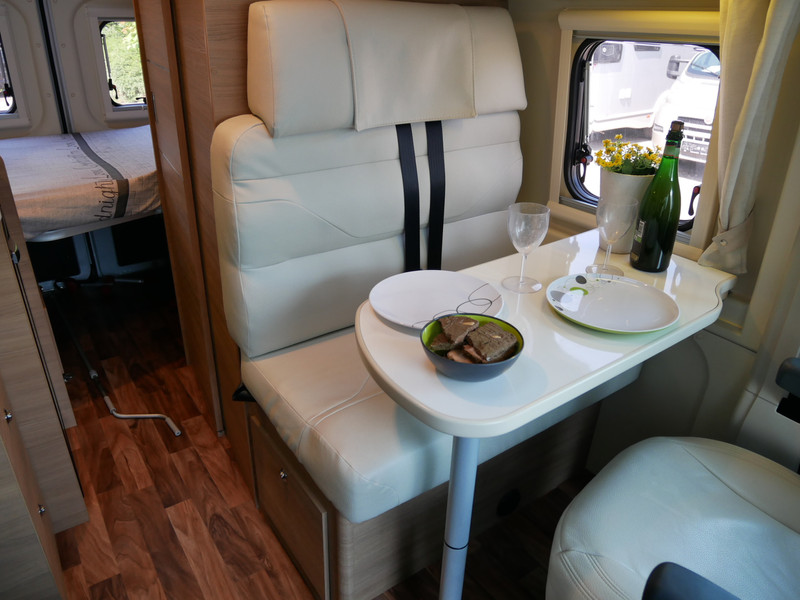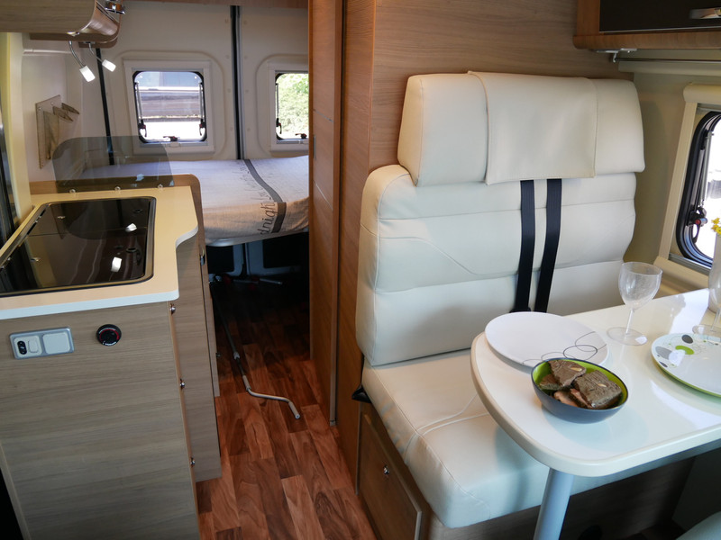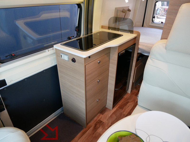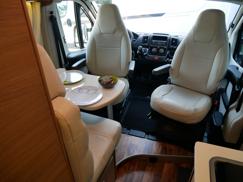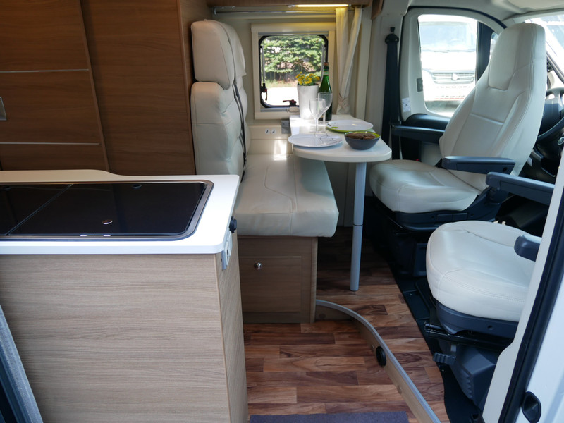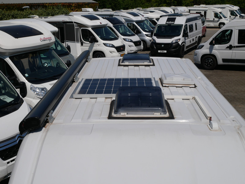 De camper is onder andere voorzien van een compacte en fijne indeling zoals lederen bekleding, keuken met 2 pits kooktoestel, dwarsbed, cruise control, Webasto dieselkachel, boiler, koelkast, modern en donker ogende tinten in het interieur, wasbak, motorairco, zeer veel opbergmogelijkheden door de vele bovenkasten, toiletruimte met doucheruimte, een zit met tafel en verduistering rondom.