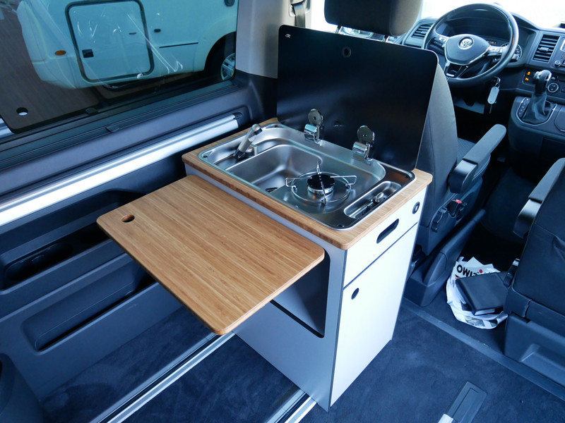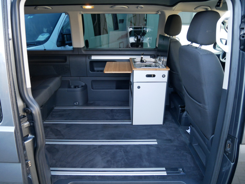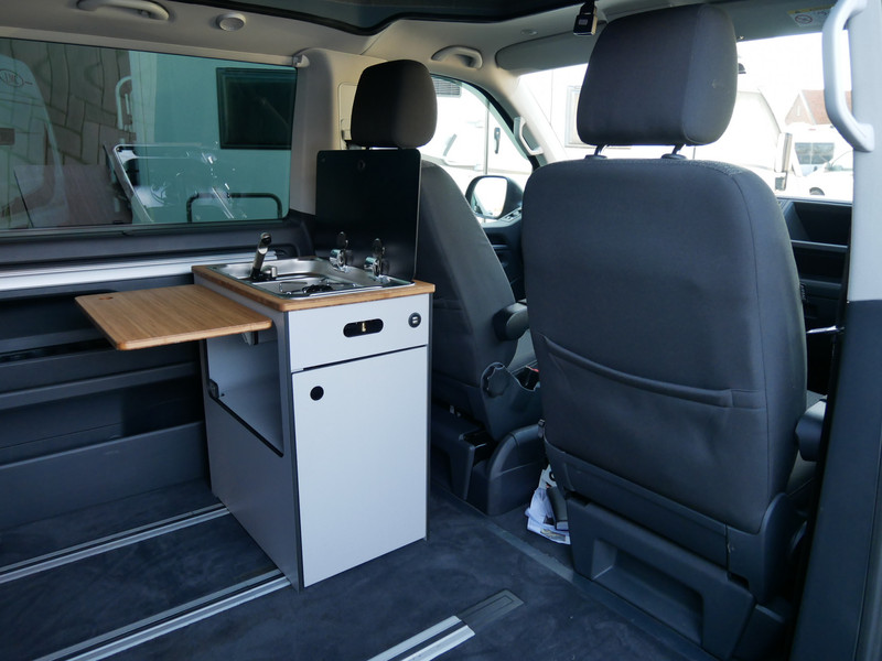 De buscamper is onder andere voorzien van 4 slaapplaatsen, Easy fit slaaphefdak van Reimo met het luxe bed (schotels), DSG Automaat, climatronic airco, cruise control, stoffen bekleding, elektrische ramen voor, elektrisch verstelbare spiegels, parkeersensoren voor en achter, in hoogte verstelbare voorstoelen, bluetooth functie, navigatie, keukenblok, 1 pits gastoestel en wasbak.