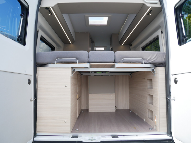 Maten: De camper heeft een stahoogte van 188 cm en de lengte bedden links: 190 X 85 cm, rechts: 185 X 85 cm en volle breedte met tussenstuk: 195 cm.