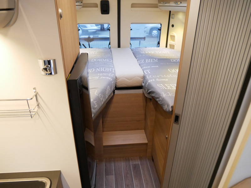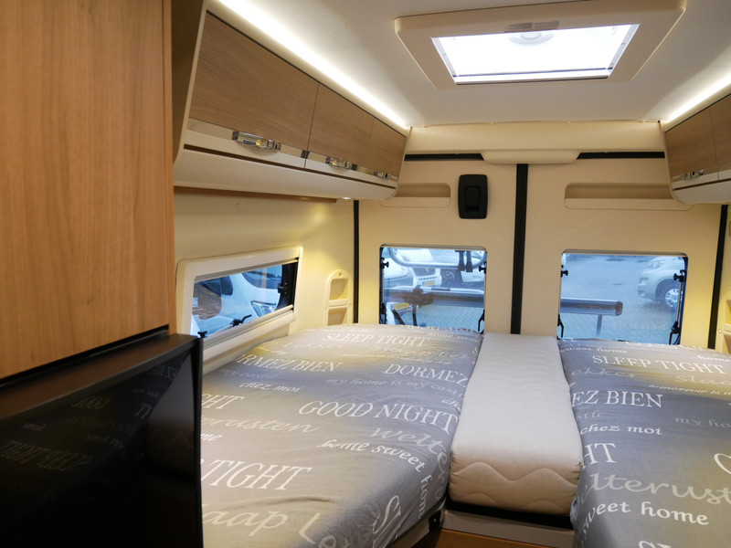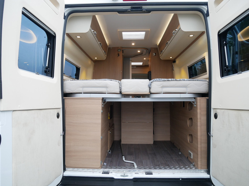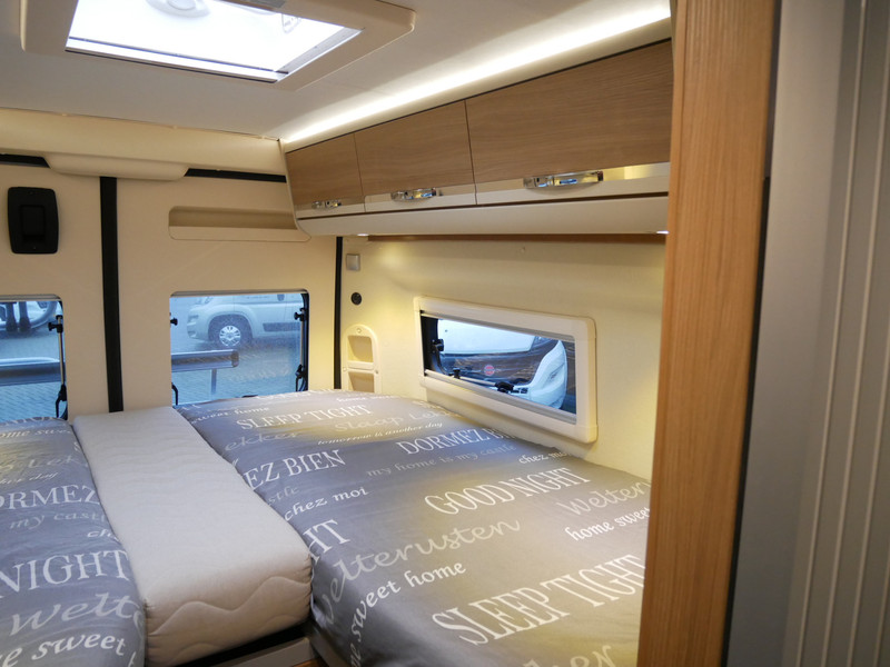 Maten: De camper heeft een stahoogte van 188 cm en de lengte bedden links: 190 X 85 cm, rechts: 185 X 85 cm en volle breedte met tussenstuk: 195 cm.